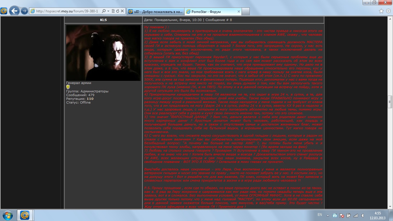| Доброго времени суток ! Собственно говоря этот скрин о принятии или непринятии в клан ТопСекрет ( твинка Бэда ) был выложен не случайно . Ибо на мой взгляд вы просто обосрали мембера также его клан у себя на форуме , который Вам ясно написал цель своей заявки в Вашу ги . Почему Вы тупо ему не отказали или молча не поставили " + " В конце концов это не важно . Вы по-моему упивались собственными изречениями своего " могущества " в данном вопросе . Уважаемый Мастер , свои истории столетней давности оставьте в папке в пыльном углу . А теперь я Вам обьясню откуда сумма в 50 кк . ( это Ваша цена за якобы причиненный ущерб Вашему клану от персонажа Райдера ). В таком случае и заявлении покажите мне скрины с выпавшими вещами на эту сумму расходы хирок и прочей лобуды . Согласитесь звучит как-то уныло глуповато ...Но замечу - это ВАШИ ТРЕБОВАНИЯ . В свою очередь я как представитель своей гильдии имею полное право требовать обратное . Как Вам такой расклад уважаемый ? Так же я могу Вам настоятельно порекомендовать распустить свой клан в целях дать хорошим людям нормально играть не находясь в Вашей гильдии. Как Вы на это смотрите ? Что касается Вашей сокланши....кхе кхе ...мне лично смешно, что же вы не легли костьми как утверждали , чтобы удержать человека , которого Вы вырастили и т.д. и т.п. Да Вы просто ноль , и обычный демагог , кроме как своей гордыни и упрямства , ценизма, надменности - никаких других ценностей не имеете )))). Продолжу ...кто у вас на испытательном сроке - НАС ЭТО НЕ КАСАЕТСЯ - Ваш клан 3-ий раз выступает у нас в разделе жалобы со скринами , и 2 раза уважаемый мастер при всем вашем негативе в нашу сторону оплачиваете перемирие. Так вот ....Нравится Вам это или нет ...требования следующие : 1. Извинения в горн от лица Мастера нашему соклану Райдеру7 за высказывания в его адрес нелицеприятные вещи. 2. Заплатить 50 кк ( так я расцениваю компенсацию за агры якобы игроков на ИС ). 3.Распустить клан ТопСекрет.